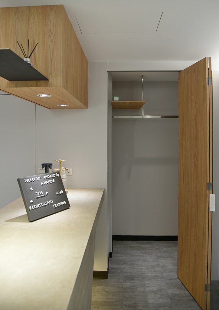 設立開放式多功能吧檯 & 隱藏式掛衣空間 方便人員使用